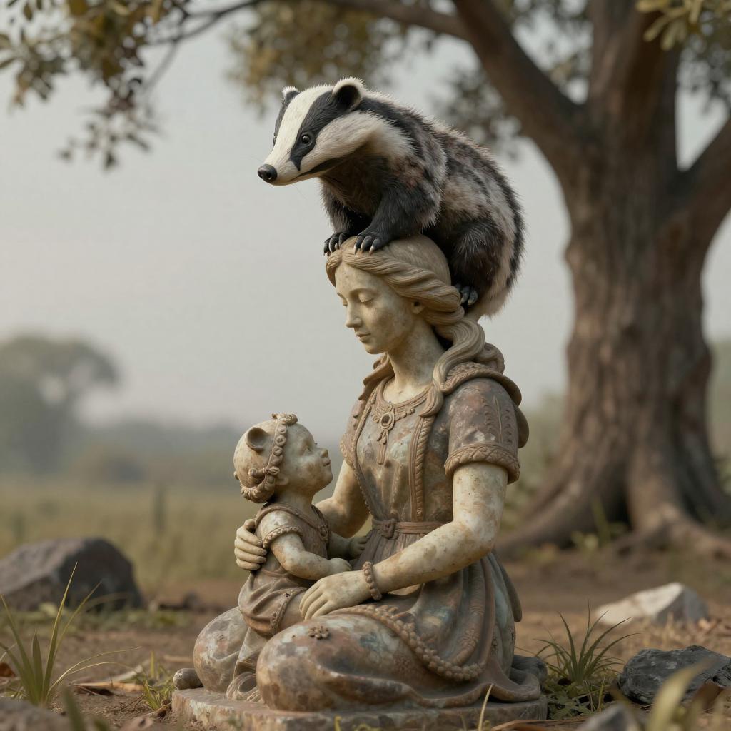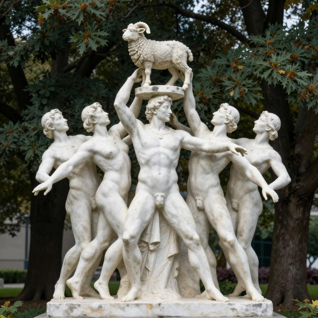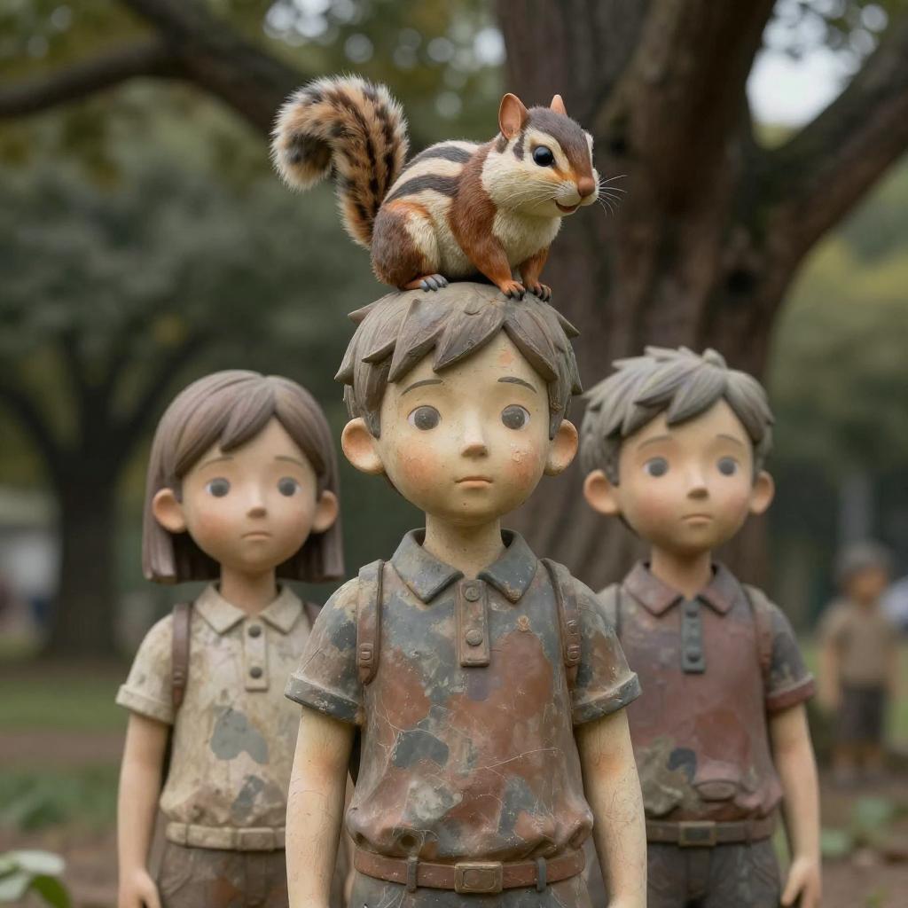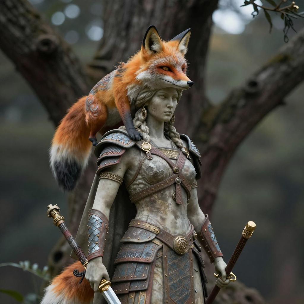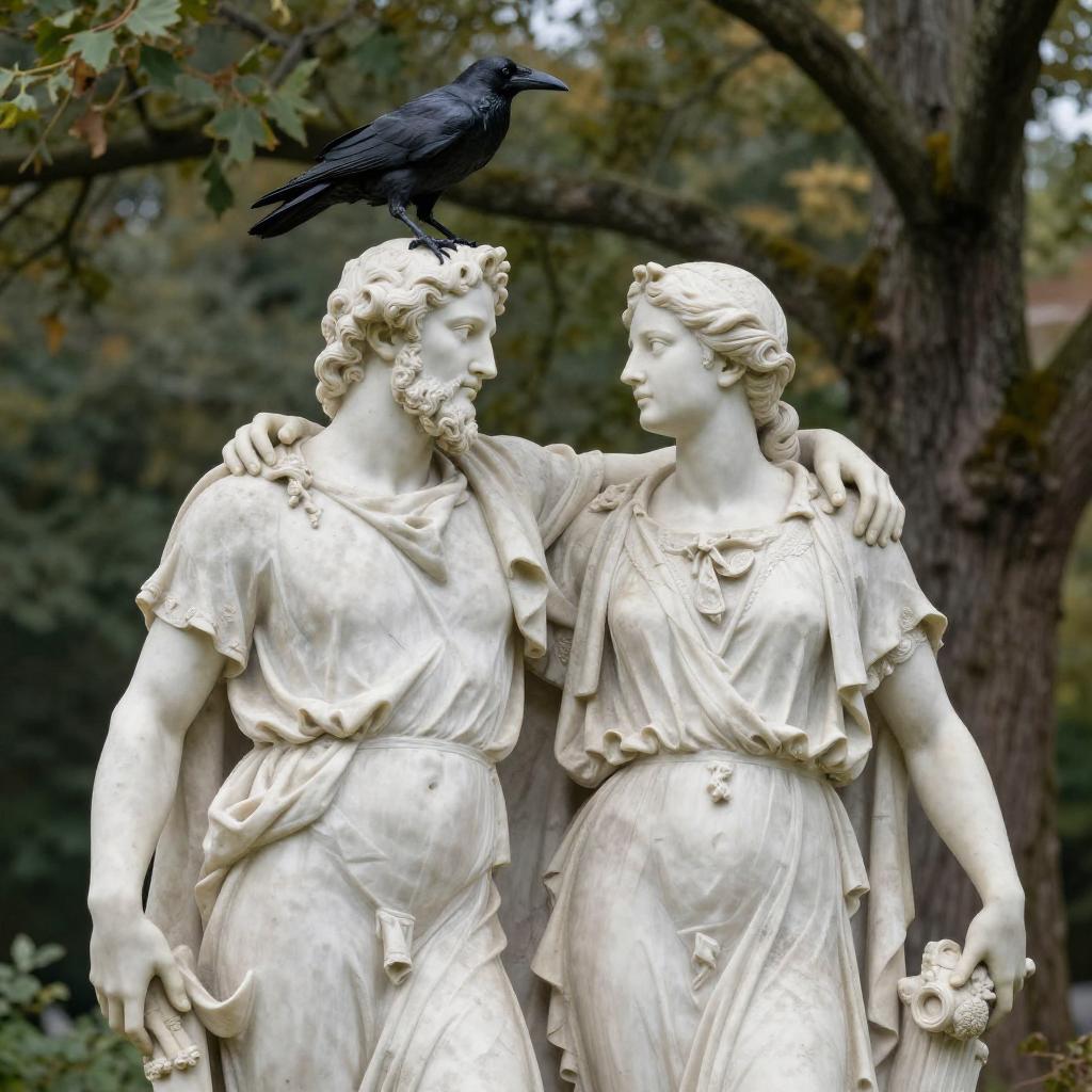 Statue of a scientist and artist with a goldfinch on their head, and a tree in the background, inspired by abstract