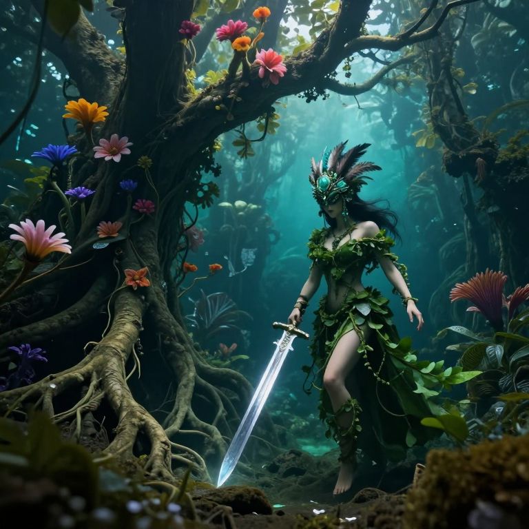 A surreal digital artwork portraying an enigmatic being with shimmering, semi-transparent skin standing atop a flowing waterfall amidst a dreamlike forest. The scene is bathed in an otherworldly radiance emanating from within the subject, creating captivating patterns on the surrounding flora. This mystical character, dressed in intricate metallic armor that appears to change and flow with their movements, holds a sword forged of pure moonlight, its blade slicing through the air like shimmering mercury. The viewpoint is from below the waterfall, providing an aerial perspective as rainbows dance across the misty ambiance, instilling a sense of awe and intrigue while delving into themes of cosmic allure and inner fortitude.