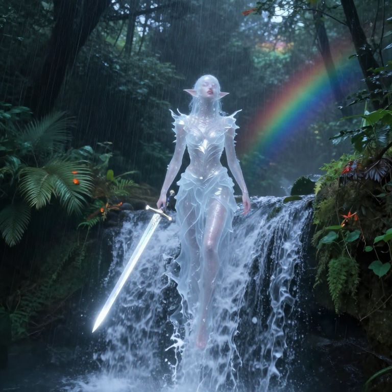 A digital fantasy artwork depicts a glowing, ethereal female warrior with a translucent, white, flowing gown and pointed hat, standing in a rainforest waterfall. She holds a radiant, glowing sword in her right hand. Her pale skin contrasts with the dark, lush greenery around her. A vibrant rainbow arcs across the misty background. Water cascades around her, partially obscuring her legs. The scene combines mystical and magical elements with a sense of power and otherworldliness.