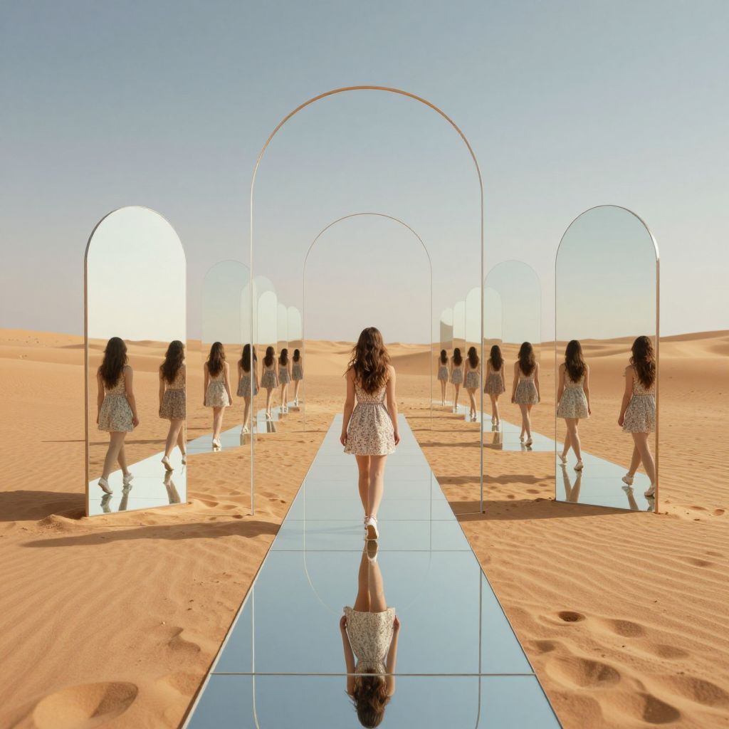 In a surreal desert landscape, a woman walks along a mirrored path where each archway reveals her own reflection, creating an endless procession of alternate selves stretching into the horizon.