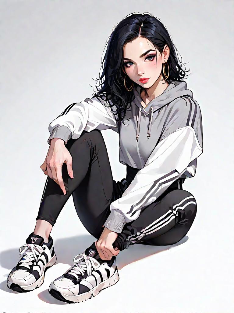 1girl, source_comics, realistic face, full body shot, Woman, sporty casual, grey fleece sweatshirt with crew neck and embroidered logo, matching sweatpants with drawstring waist, cuffed hems, black sneakers with white sole, hoop earrings, cornrow hairstyle, white studio background.