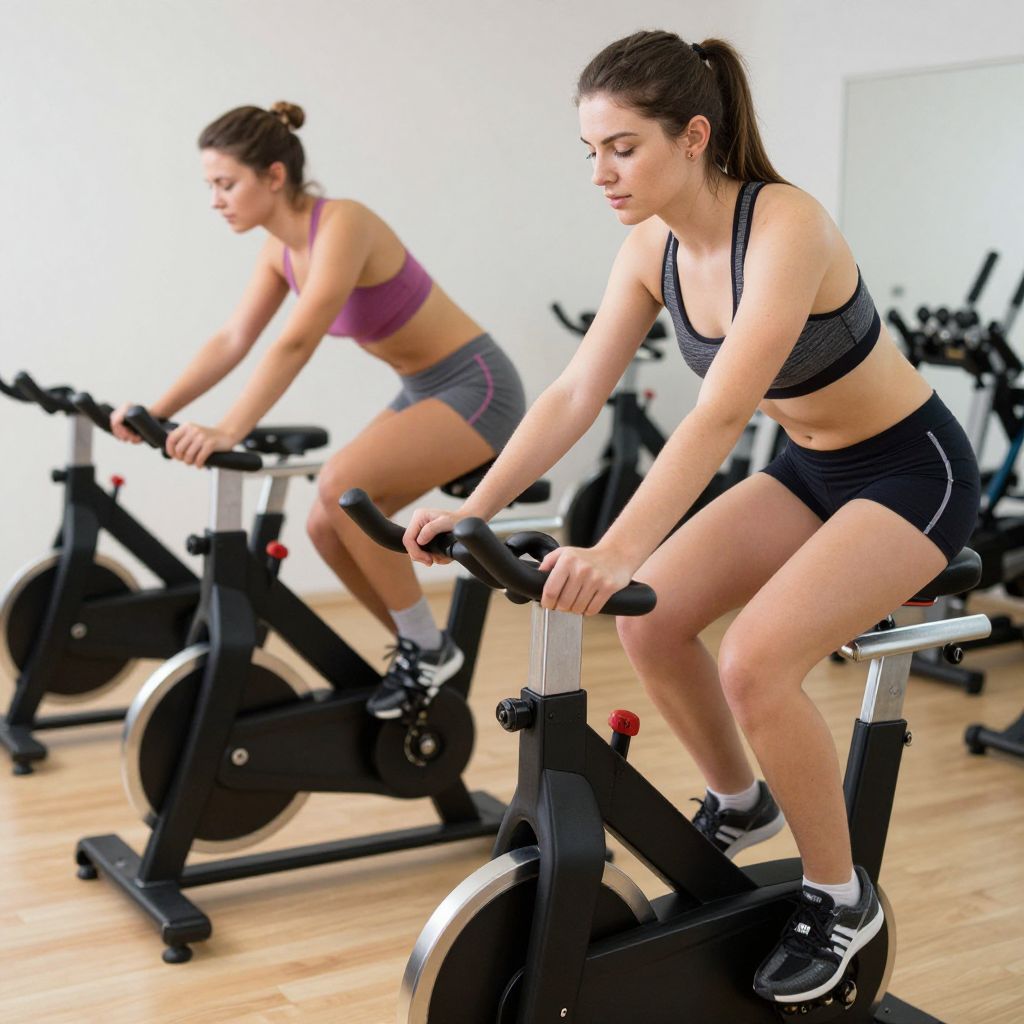 Photograph of two women in a gym, both on stationary bikes, wearing sports bras and shorts, focusing intently on their workout.