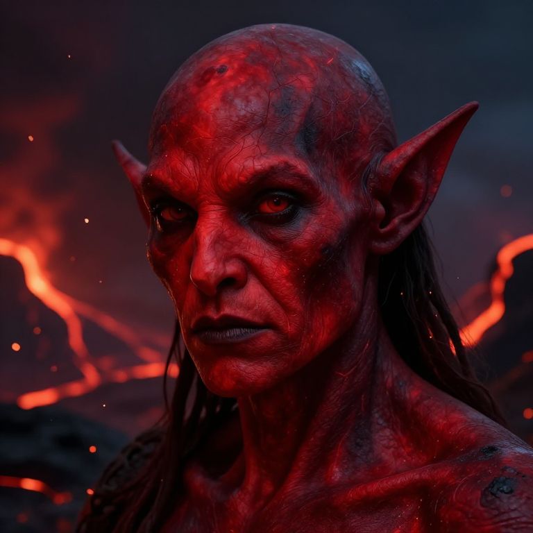 Tiefling skin prominently featuring rich crimson hues blended with dark charcoal accents, faintly glowing veins showing under the surface, with an atmospheric volcanic landscape illuminated by molten lava flows and sparks flying.