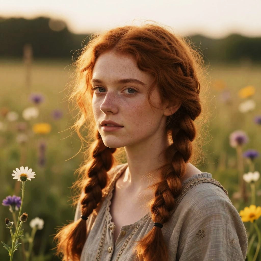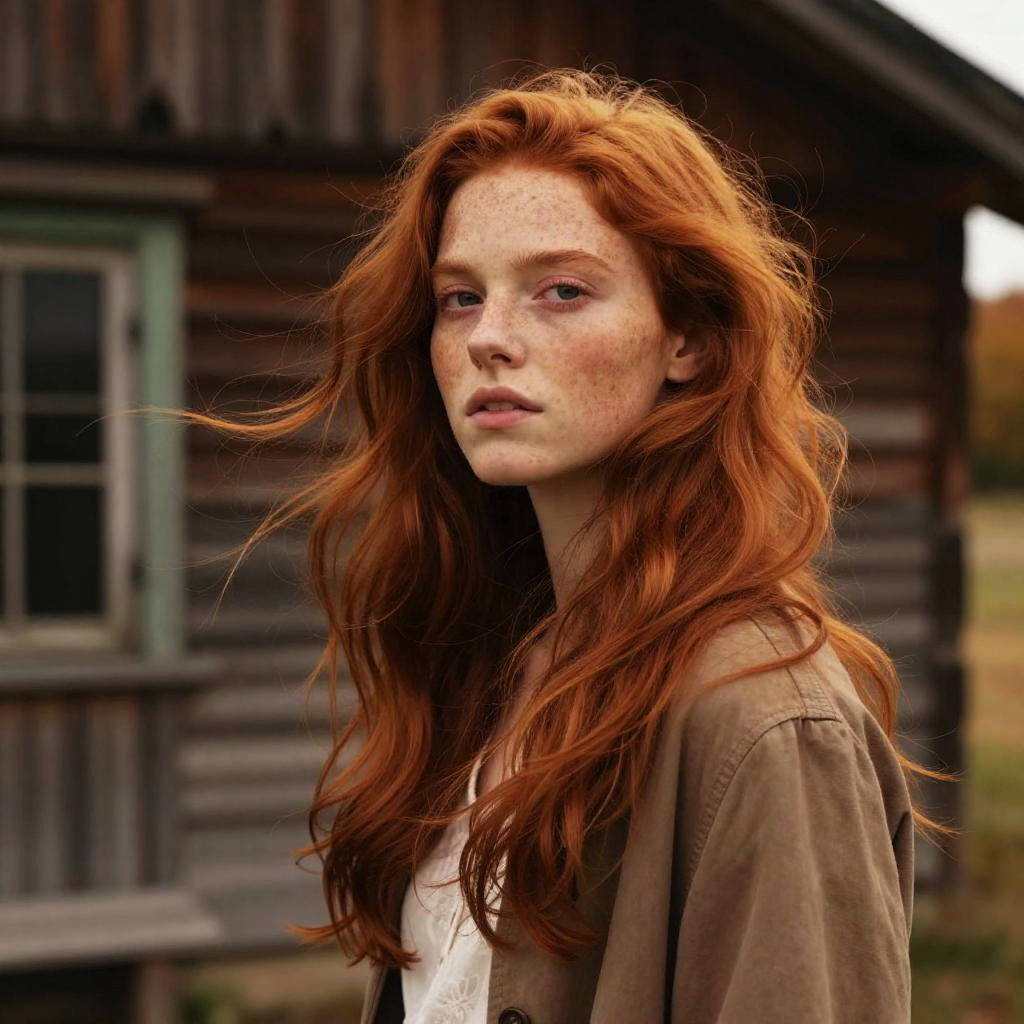 Rustic red hair flowing in the wind, set against a vintage wooden cabin backdrop, warm autumn hues, soft natural lighting, detailed strands with freckles on the face