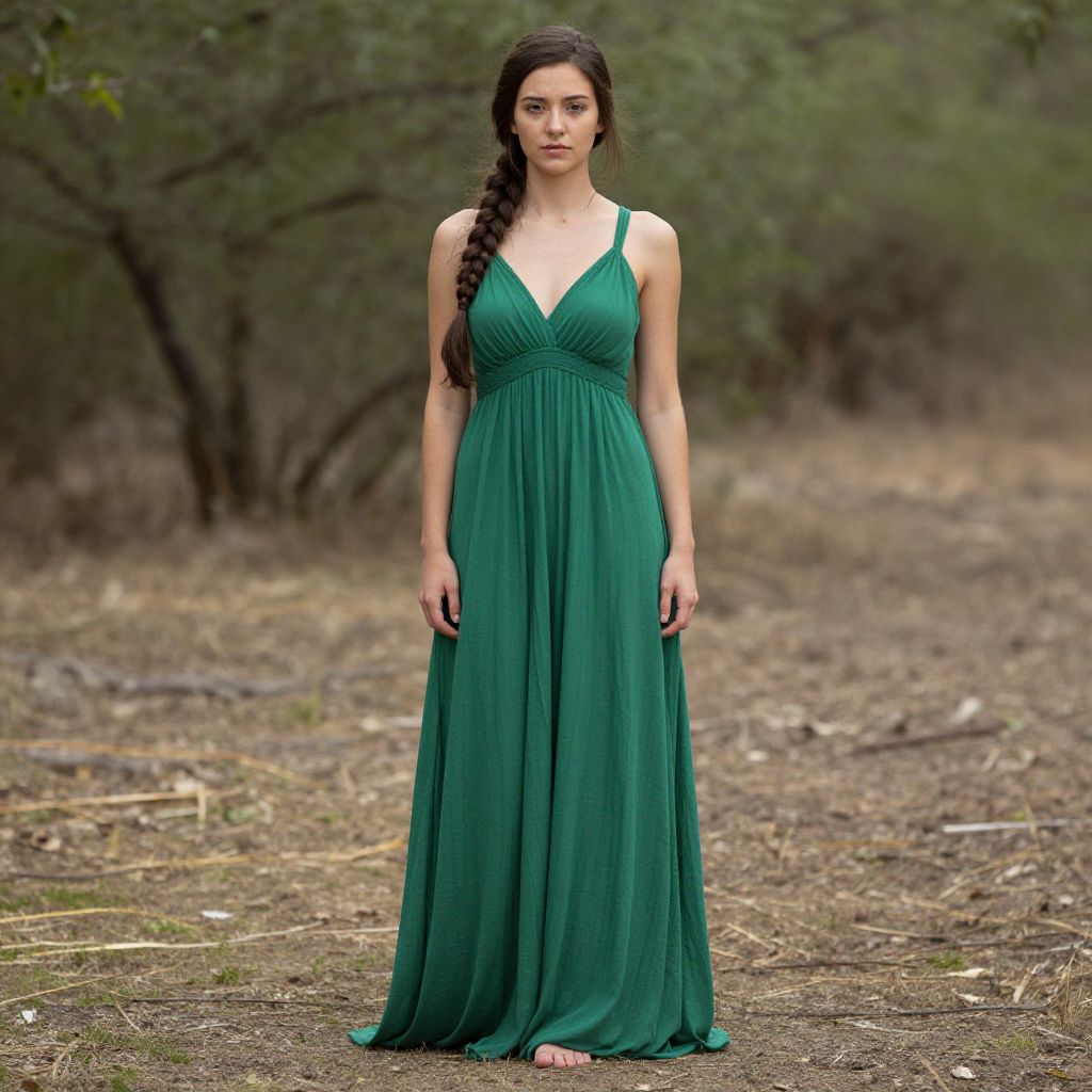"greek goddess costume green, solo, 1girl, dress, green dress, realistic, barefoot, standing, long hair, braid, photorealistic, full body, bare shoulders Realistic photo of casual sexy person with pretty face"