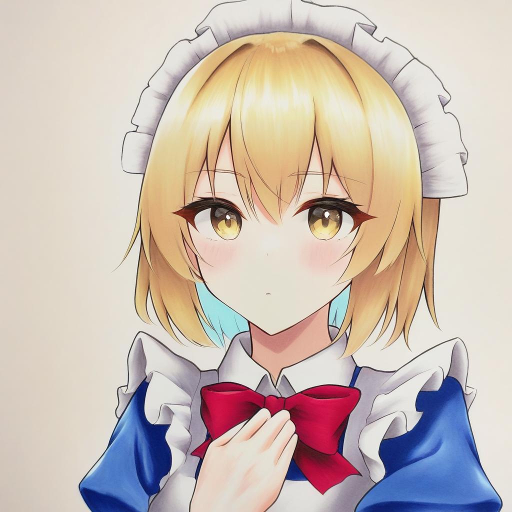 Mugetsu (touhou), touhou, 1girl, maid, maid headdress, maid, yellow eyes, blonde hair, short hair, blue dress, puffy short sleeves, red bowtie, by artist shiwa (siwaa0419), illustrious
