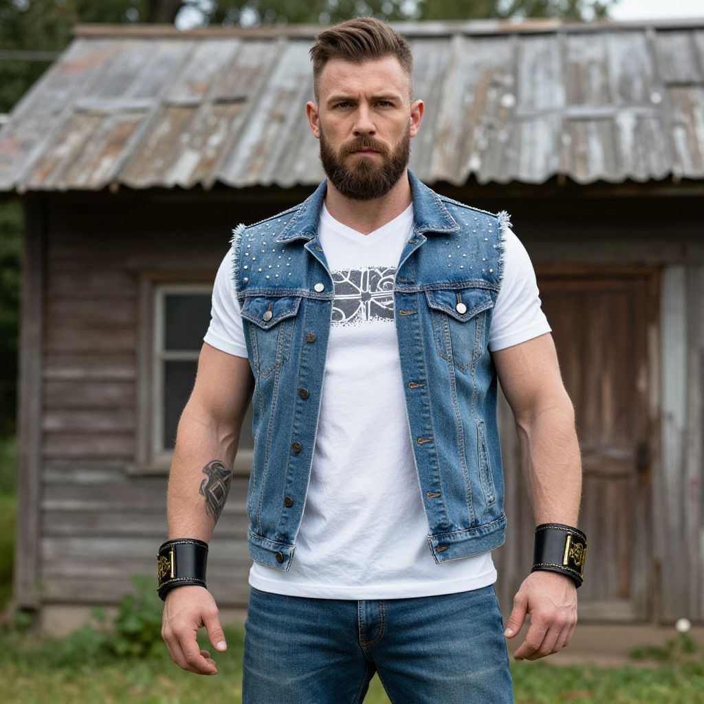 Photograph of a muscular, bearded man with short brown hair standing in front of an old, weathered wooden building. He's wearing a white t-shirt with a graphic, a blue denim vest with silver studs, and blue jeans. He's also got black leather cuffs with gold accents on both wrists. His right arm has a visible tattoo. The background has greenery and the building's worn roof.