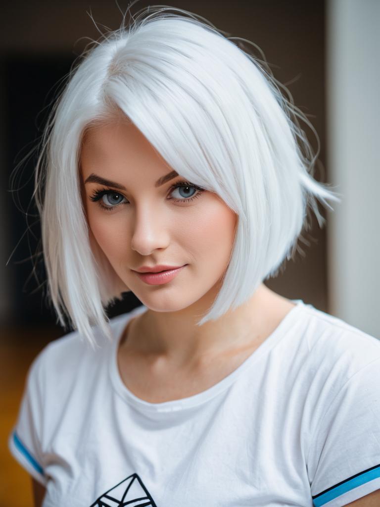 Photo-realistic cosplay photo of person in ars almal costume. 1girl, blue eyes, hair between eyes, white hair, short hair, medium breasts, white shirt, virtual youtuber, virtual youtuberlifestyle stock photo, shallow depth of field, lifestyle stock photography, shallow depth of field, natural lighting, warm tones, soft background blur, candid moments, vibrant colors, realistic textures, modern casual clothing. full body shot