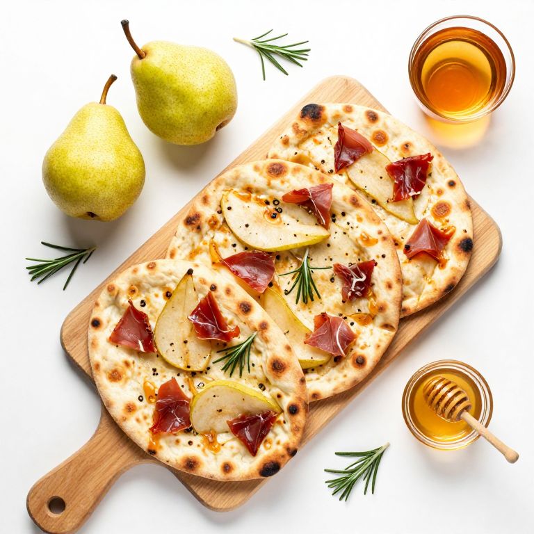Top-down view of three Ontario Pear & Prosciutto Naan-Pizzas arranged on a light wooden cutting board, accompanied by two Bartlett pears, fresh rosemary sprigs, a small pot of honey, and a glass of amber-colored liquid, all set against a clean white background.