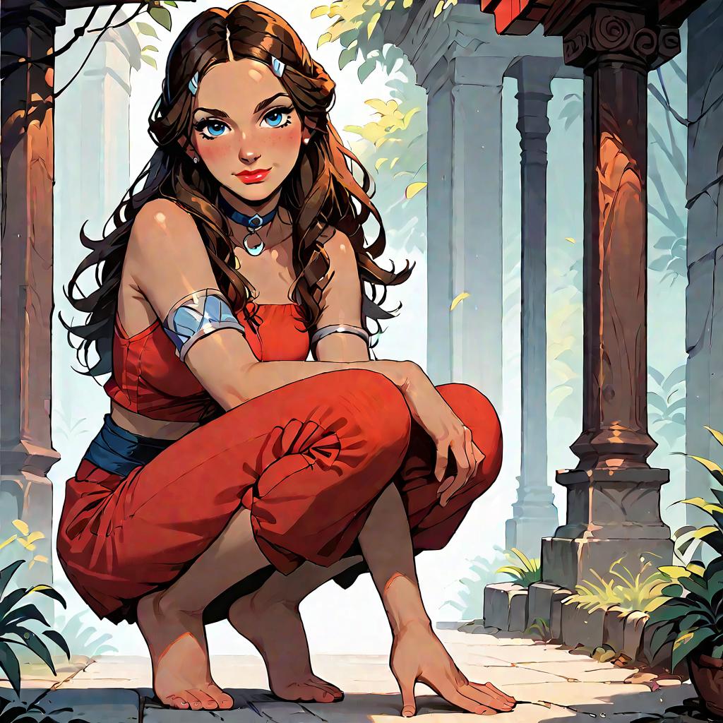 Illustration of an anime-style young woman with long brown hair, blue eyes, and dark skin. She is wearing a red crop top, red pants, and armlets, along with a choker necklace. The character is barefoot and squatting on a stone floor in an outdoor setting with ancient stone pillars and greenery around.