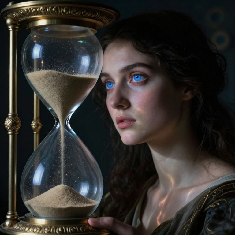 Photorealistic digital artwork of a fair-skinned woman with blue eyes and wavy dark hair, holding an ornate hourglass with sand, against