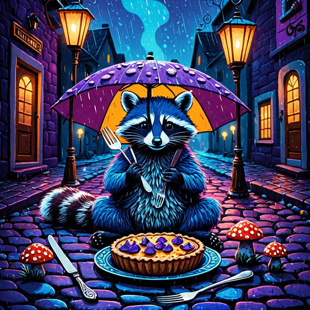 Illustration of a whimsical blue raccoon seated on a rainy cobblestone street illuminated by glowing yellow lanterns. The raccoon holds a tiny fork and knife, ready to eat a purple mushroom pie placed on a decorative plate. The scene features a folk art style with bright, bold colors, textured brushstrokes, and simple, naïve shapes, creating vivid complementary contrast.