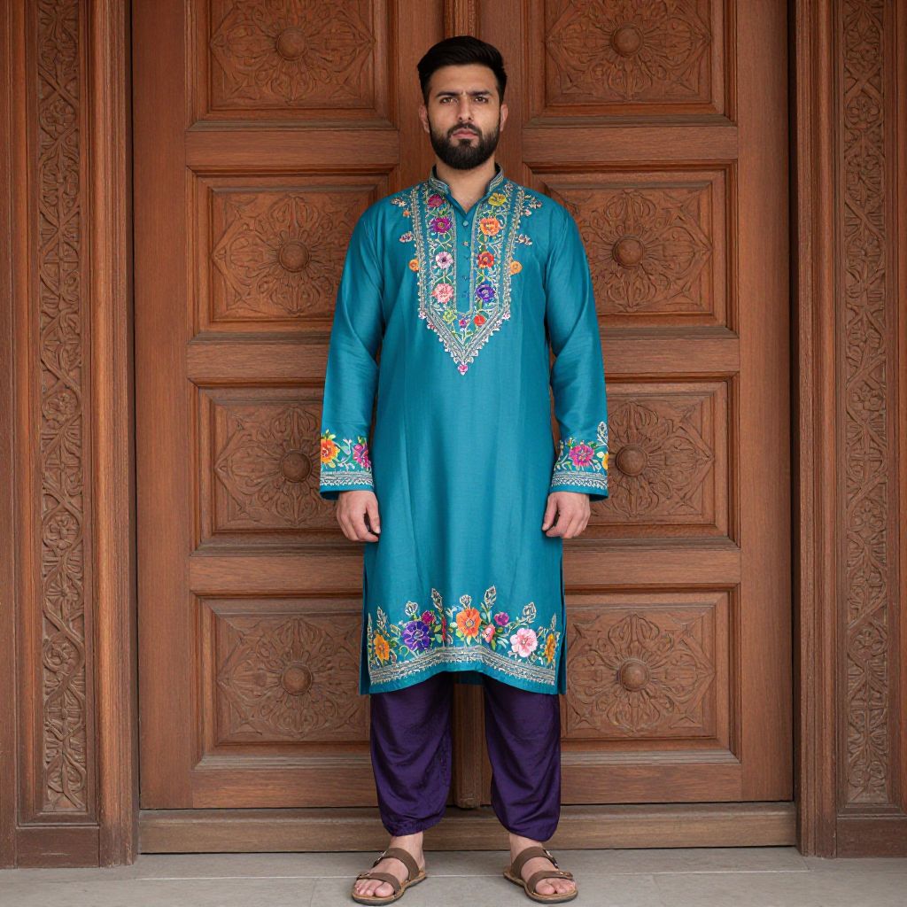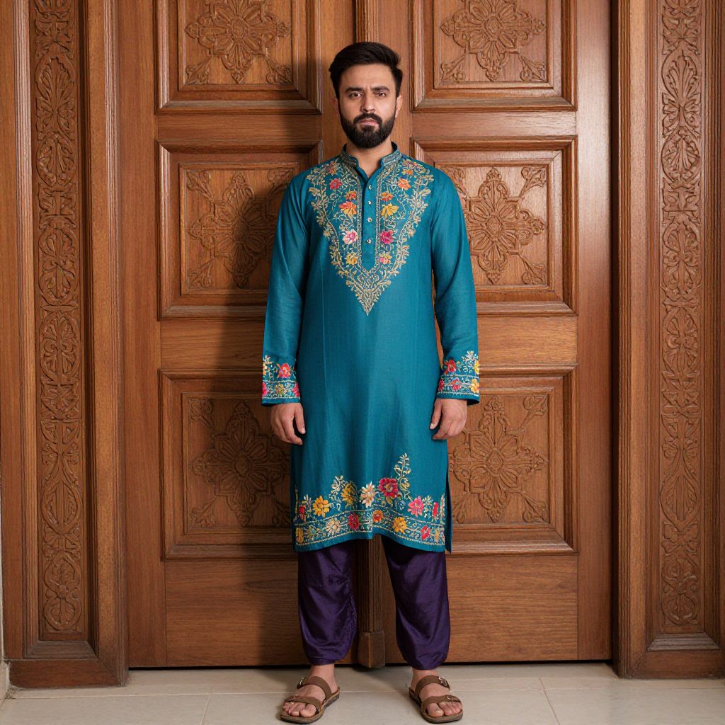Photograph of a bearded man standing in front of an intricately carved wooden door. He's wearing a teal, long-sleeve traditional Pakistani kurta adorned with colorful floral embroidery on the chest, sleeves, and hem, paired with dark purple pajama pants and brown sandals. The wooden door behind him has a rich, warm brown tone and elaborate patterns. The man has a serious expression and short, dark hair.