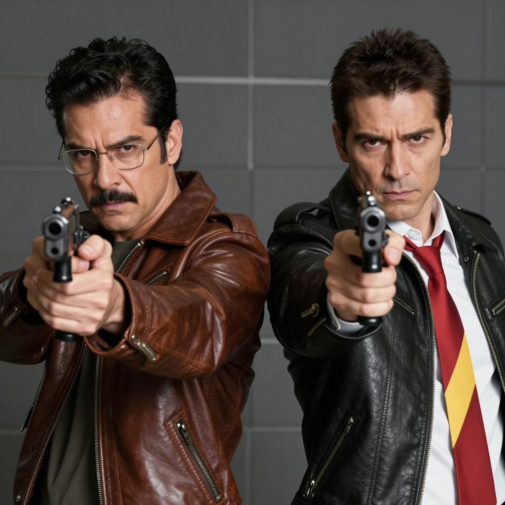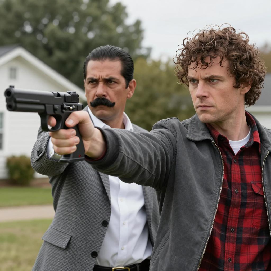 Black and white photograph of two men. Foreground man with curly hair, intense expression, wearing jacket. Background man with mustache, serious expression, holding handgun, wearing suit. Both close to camera. Simple white background.