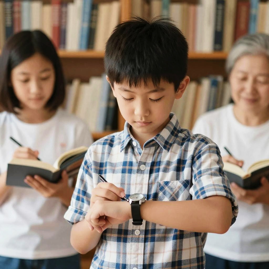 Shirt, multiple boys, plaid shirt, multiple girls, indoors, watch, realistic, wristwatch, closed eyes, black hair, holding, bookshelf, blurry, white shirt, book, brown hair, 2girls, short hair, plaid, pen, smile, short sleeves, old, holding pen, old woman