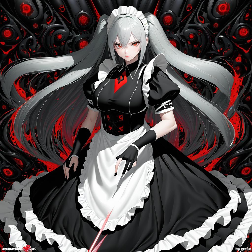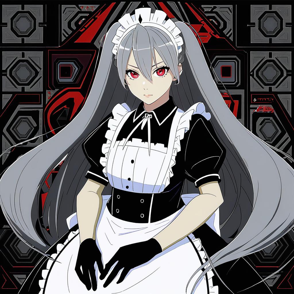 Digital anime-style illustration of a female character dressed in a traditional black and white maid outfit with a maid headdress. She has very long grey hair styled in low ties, striking red eyes, and wears partially fingerless black gloves. The detailed artwork features a voluminous black dress with white frills and a dark abstract background.