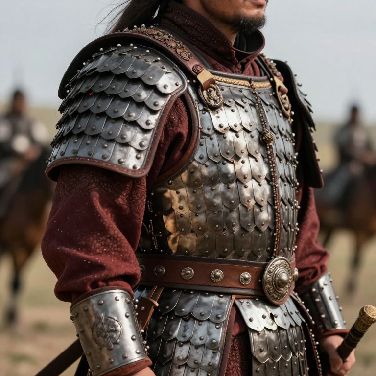 A person is wearing a blue and gold armor with a helmet and a scarf around their neck.