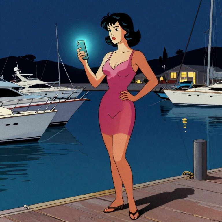 Cartoon-style drawing of a woman in a pink dress, holding a glowing phone, standing by a nighttime marina with yachts.