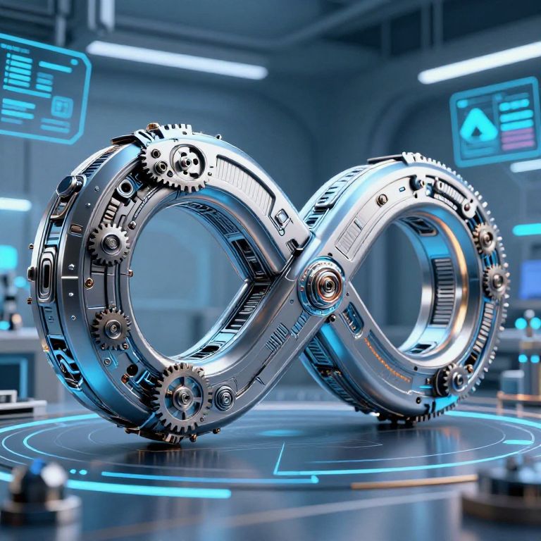 Digital CGI of a metallic infinity symbol composed of interlocking gears, set on a futuristic blue-lit control room with holographic screens.