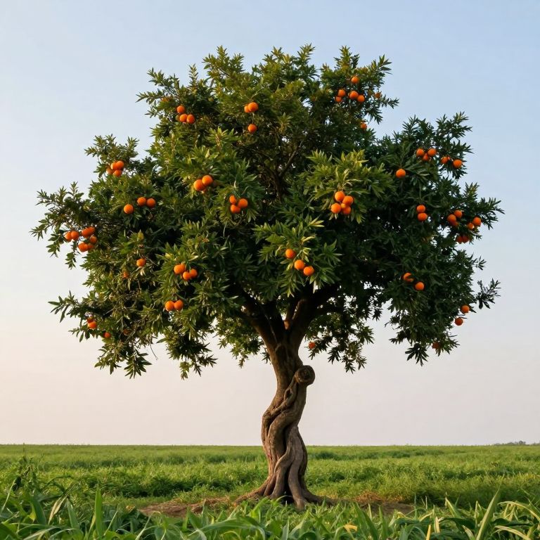 Spiraling gracefully against a serene horizon, a robust orange tree stands alone in a verdant field, its gnarled trunk twisting upward as it bears clusters of vibrant fruit amidst lush green foliage.