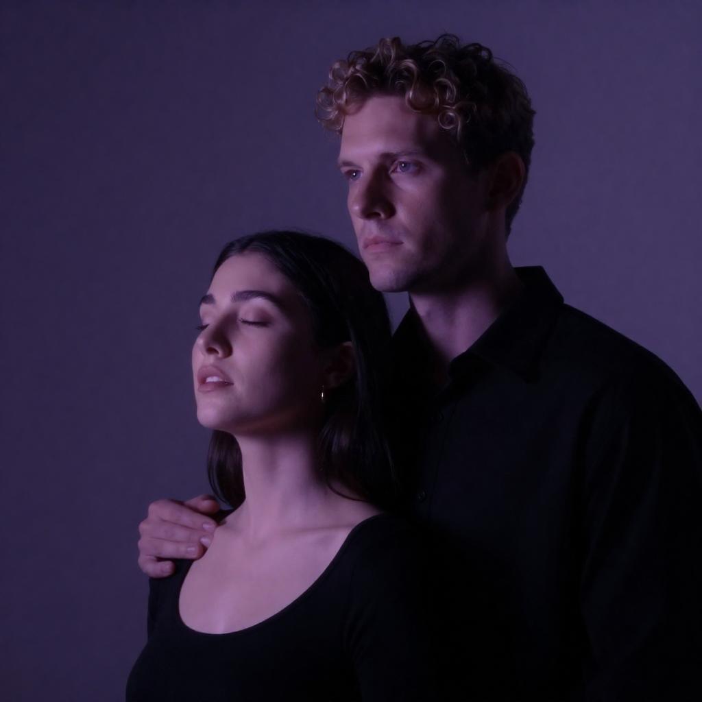Photograph of a man with pale skin, dark curly hair, and closed eyes, lying down with large black and silver helmets hovering above his head. He wears a beige turtleneck. Dark background. Man's expression is calm and relaxed. Two helmets dominate the upper right.