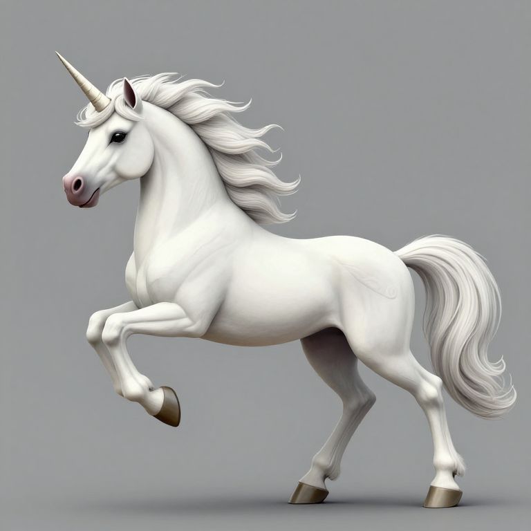 Digital CGI of a white unicorn with a flowing mane and tail, pink muzzle, and raised front leg, set against a gray background.
