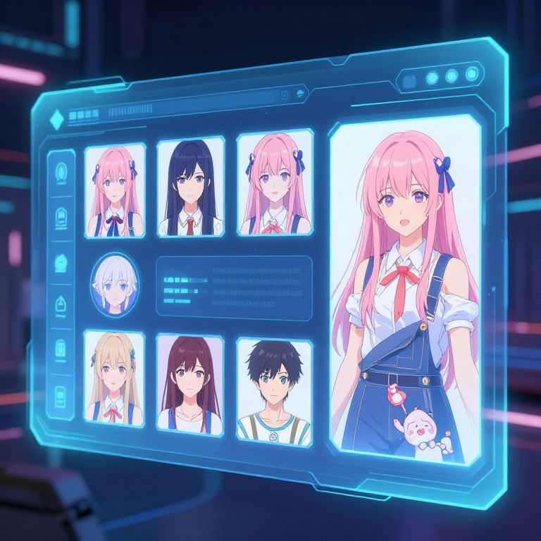 Anime generator interface showing a holographic screen with customizable anime character features, cyberpunk background, glowing UI elements, detailed character designs appearing in real-time, digital art with a mix of vibrant and soft pastel tones