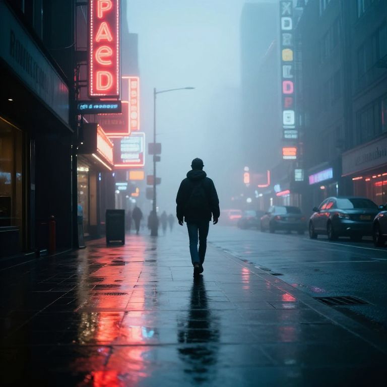 A lone figure walking through a foggy city street, with dazzling neon signs reflecting on the wet pavement, captured in a low-angle shot.