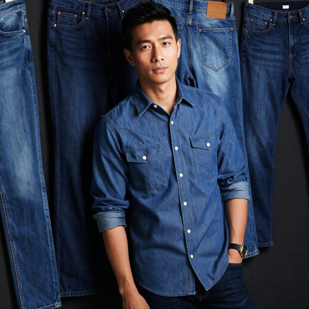 Denim Fashion Man, man in a denim shirt leaning against a wall of jeans