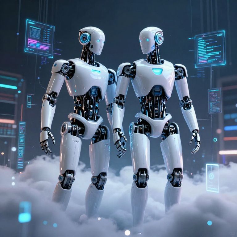 Brothers AI prompt: Two humanoid robots with intertwined cybernetic forms emerge from a data cloud, their synchronized movements reflecting shared intelligence, ambient holographic data flowing around them in a dreamlike digital environment.