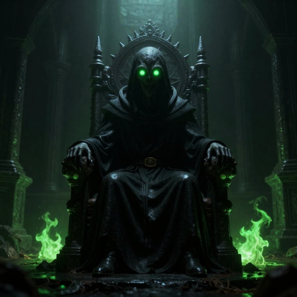 A dark, hooded figure with glowing green eyes sits on an ornate throne in a dimly lit, foggy dungeon throne room. The figure wears a black robe, surrounded by eerie green flames and green ambient light, creating a haunting and supernatural atmosphere. The detailed 3D artwork features high-quality lighting and shadows with a gothic horror theme.
