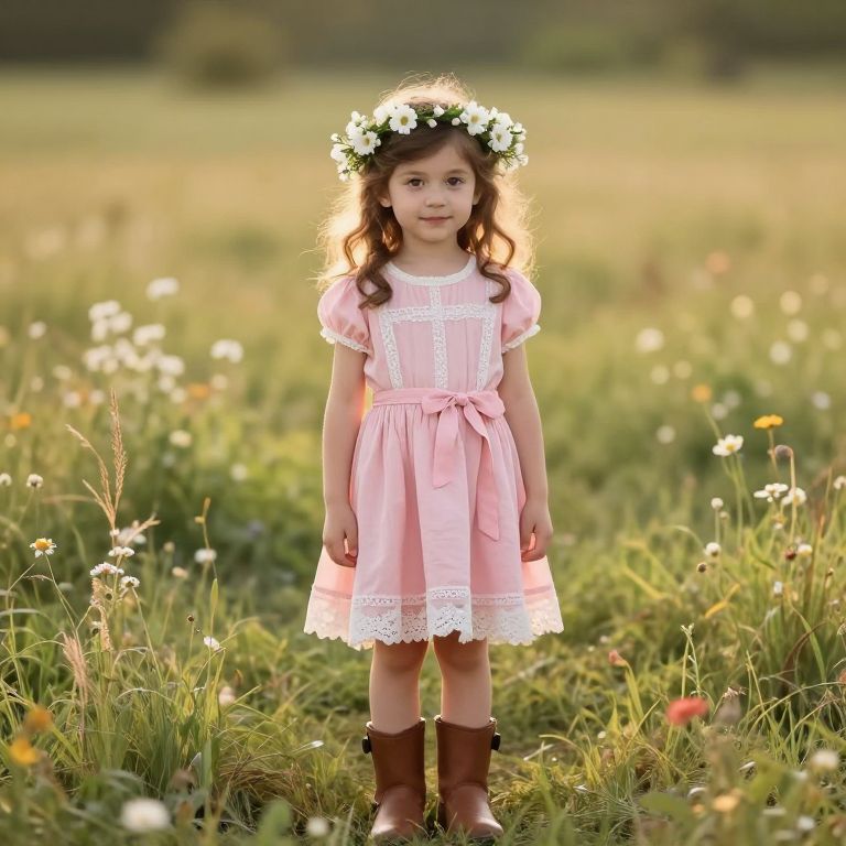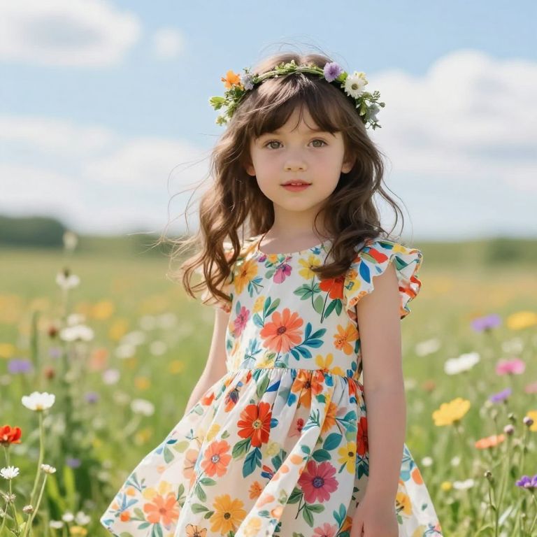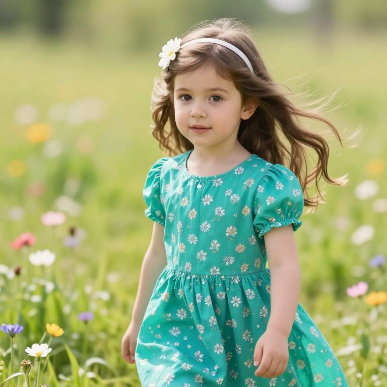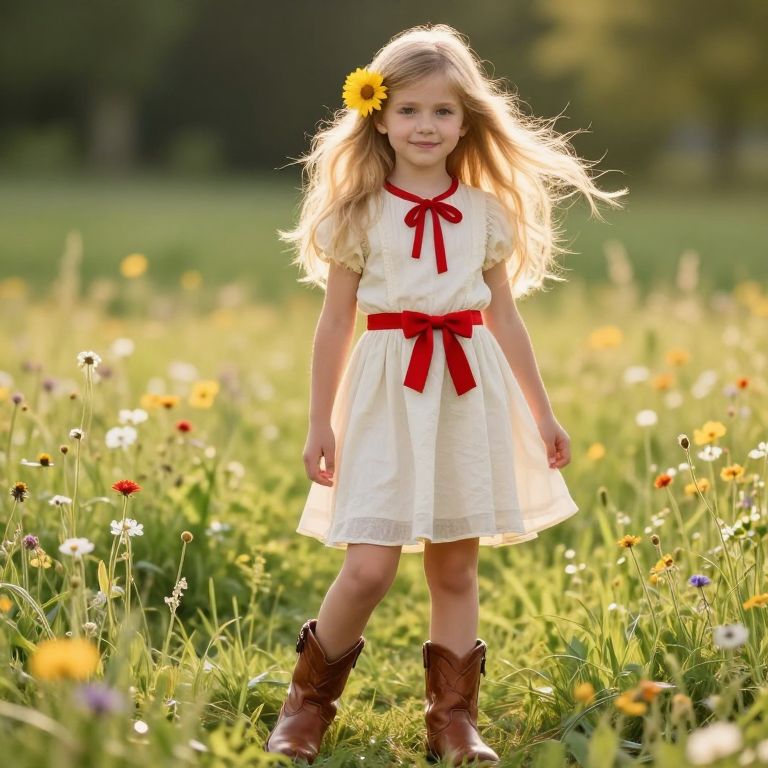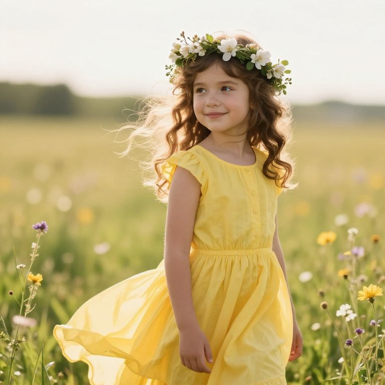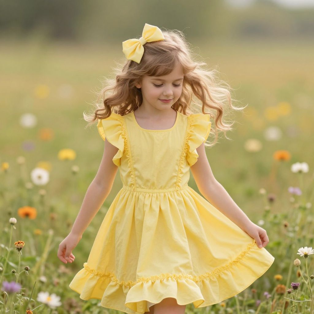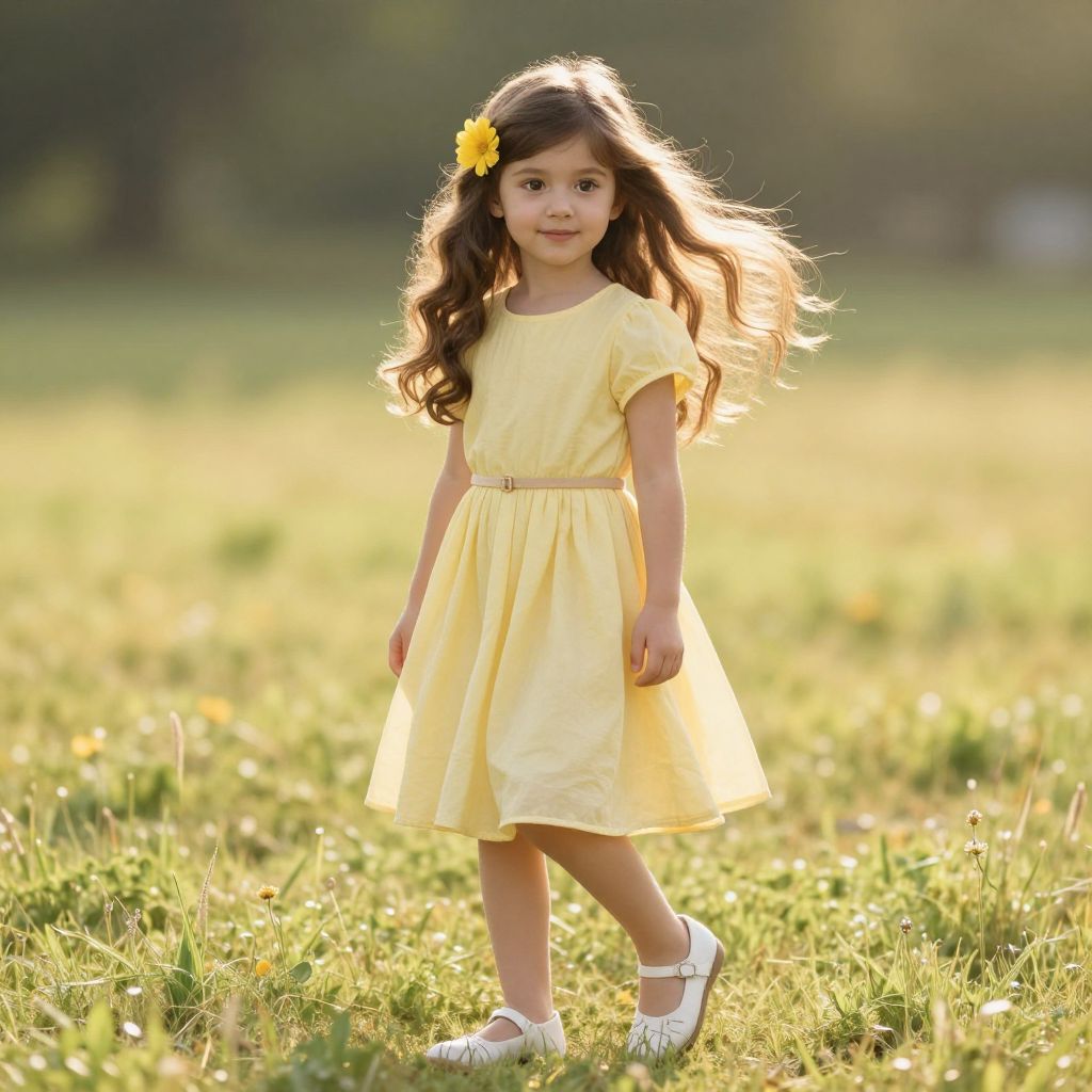 A young girl with long brown hair, soft and flowing in the breeze, is wearing a vibrant yellow dress with a black and yellow striped pattern. She has a black headband adorned with a bright yellow flower, adding a touch of charm and whimsy. She stands confidently in front of a lush field of golden yellow flowers, the sunlight gently illuminating the scene. The background features a gently rolling meadow with soft green grass and a few scattered daisies, creating a peaceful and joyful atmosphere. The overall mood is warm, nostalgic, and full of innocence and wonder.