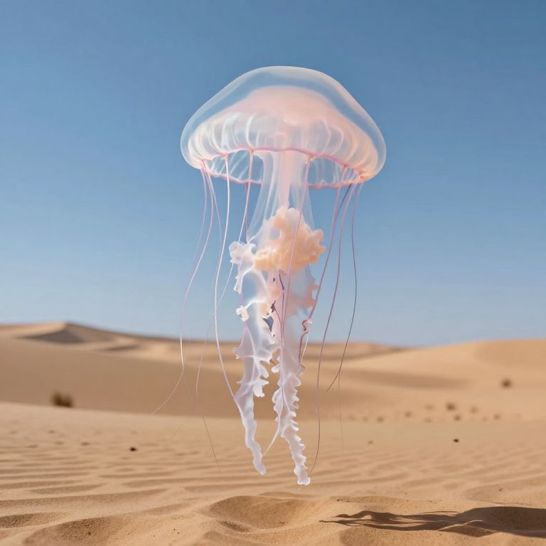 Photograph of a translucent jellyfish with a bell-shaped top and long, frilled tentacles, floating above a sandy desert landscape under a clear blue sky. The jellyfish's bell is illuminated with a soft pink glow, creating a striking contrast against the golden sand dunes in the background. The fine, white frills on the tentacles add texture to the delicate creature. The desert's ripples and small sand clumps are visible in the foreground, enhancing the surreal nature of the scene.