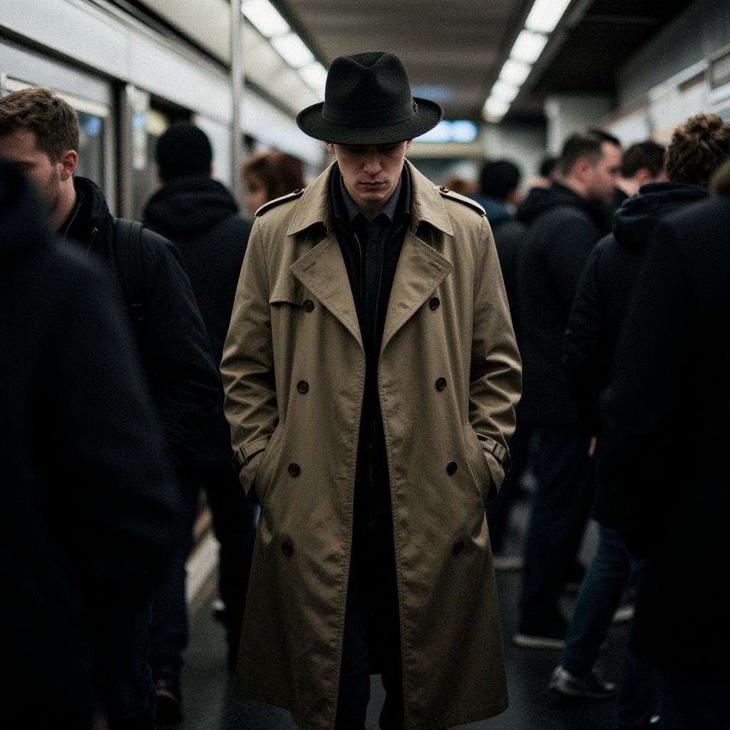 Photograph of a pale, serious man in a black fedora and beige trench coat, standing in a dimly lit, crowded subway.