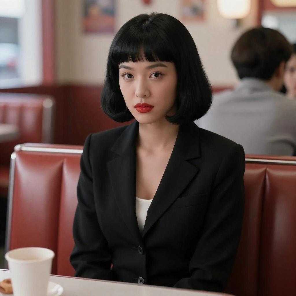 Young Asian woman with black bob haircut and red lipstick wearing a black blazer and white top, sitting in a retro-style diner with red leather seats. The setting has a vintage ambiance with a disposable coffee cup on the table.