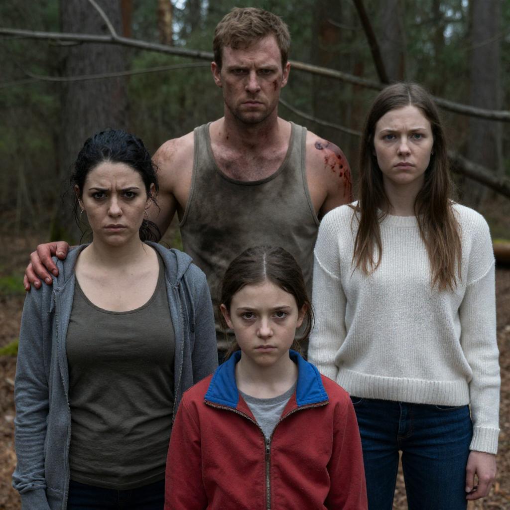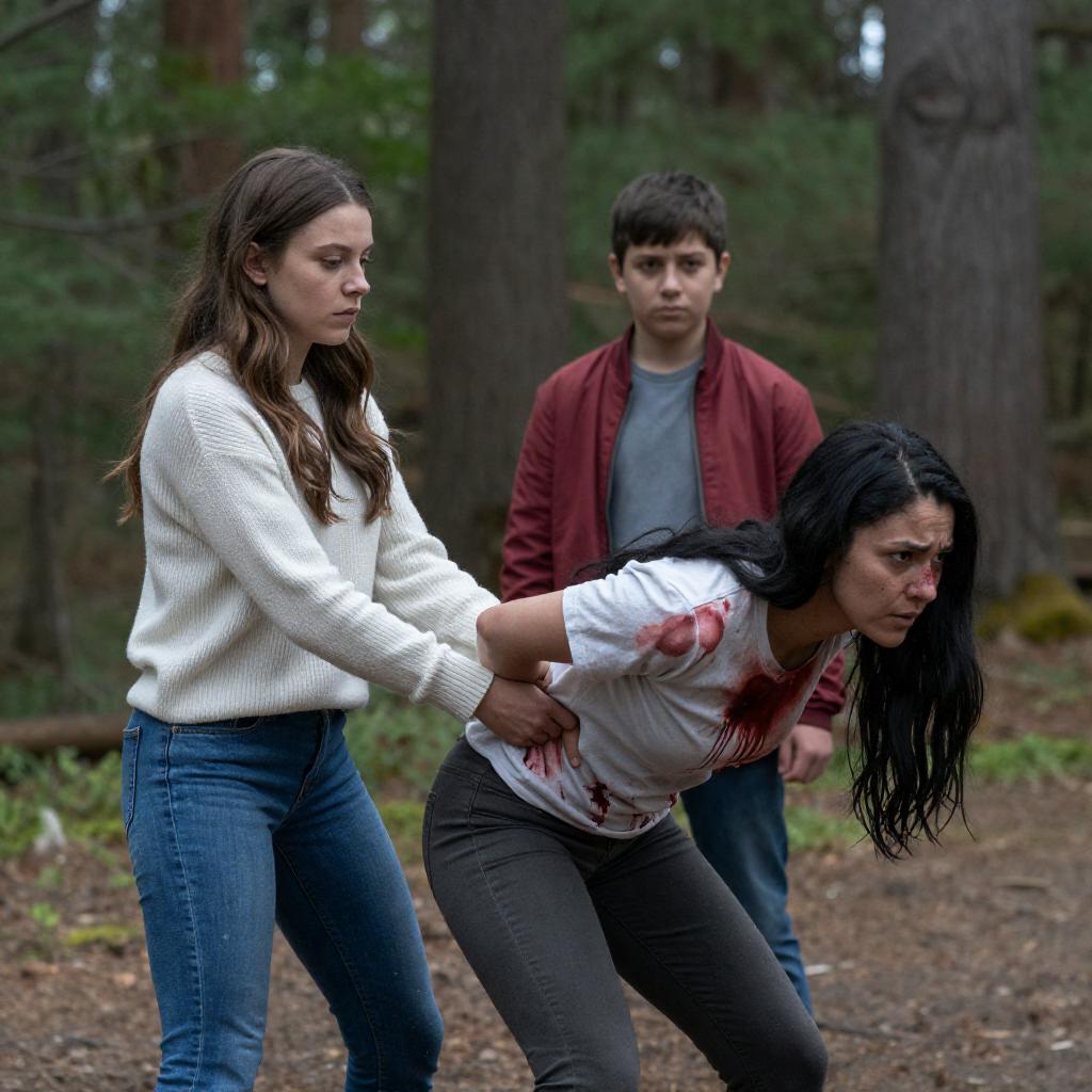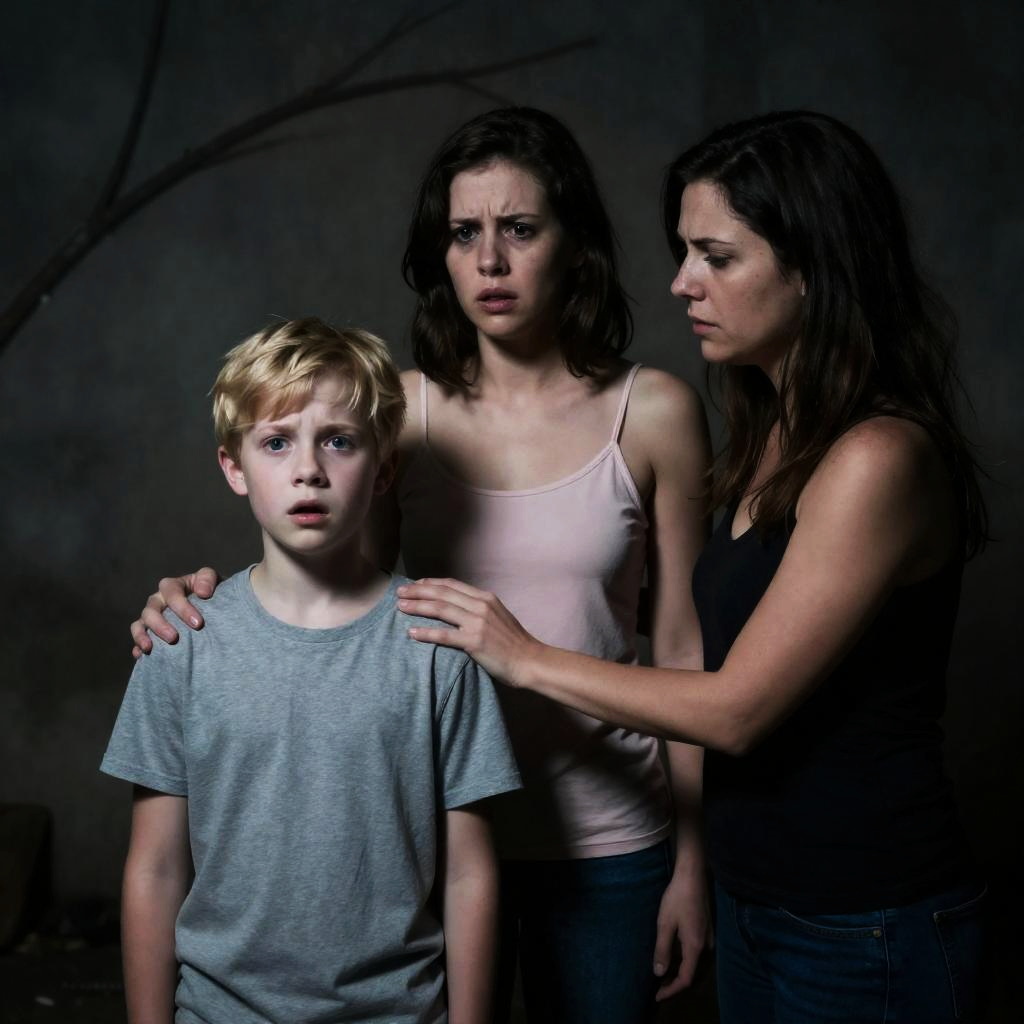Three people in a dark, grimy room. Blonde boy in gray t-shirt, frightened. Brown-haired woman in pink camisole, panicked. Brunette woman in black top, protective arm around boy. Stone wall with branches in background. Intense expressions.