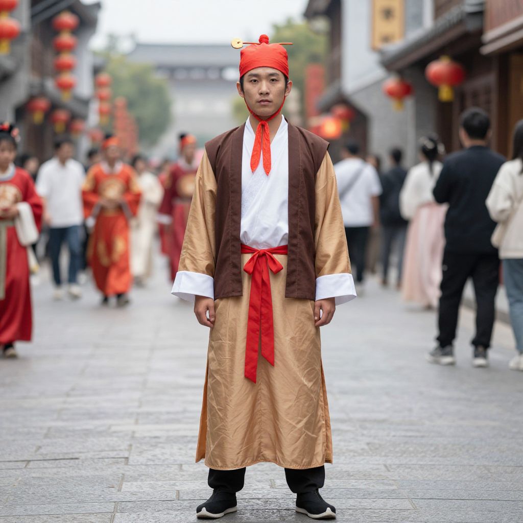Photograph of a young Asian man standing in a traditional Chinese street festival. He wears a red headband, white shirt, brown vest, and long golden-brown robe with a red sash. His black shoes peek out from the robe's hem. The background shows blurred festival-goers in colorful traditional attire, red lanterns hanging from buildings, and a cobblestone street. The man's expression is neutral, and the scene is vibrant with cultural elements and festive decorations.