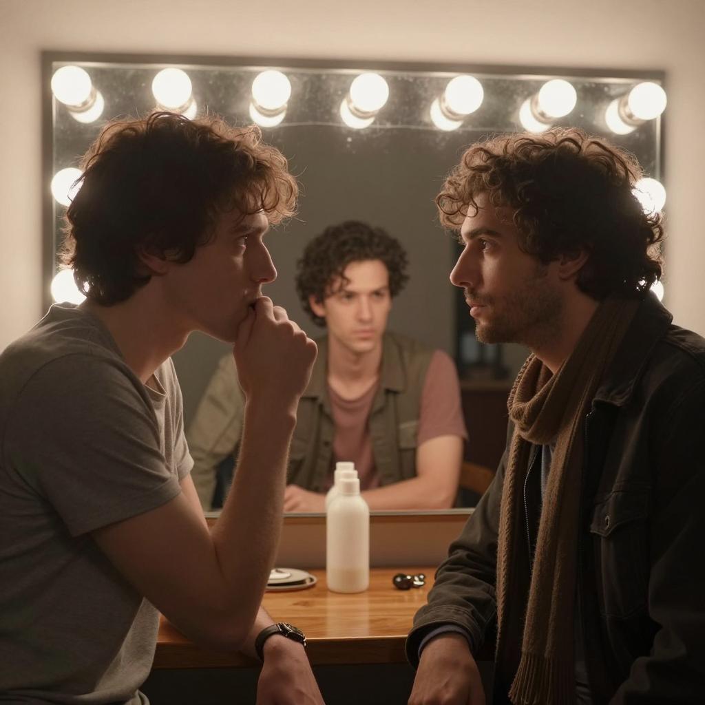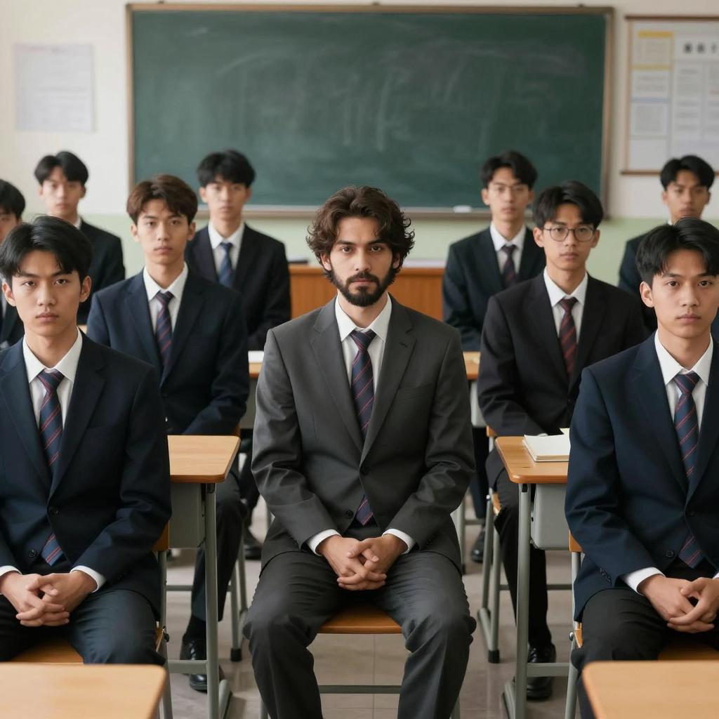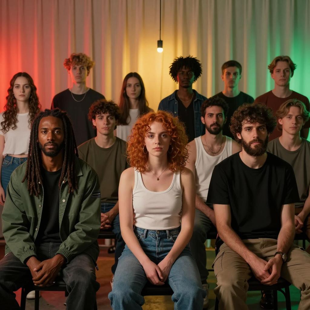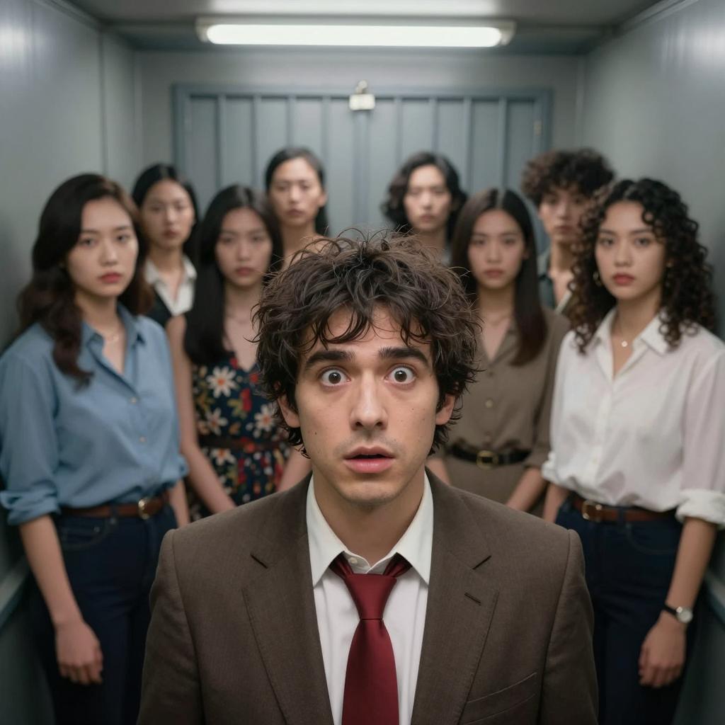 Man with dark, messy hair in brown suit and red tie with white shirt, wide-eyed and surprised, in foreground. Six women with varied hairstyles and clothing stand behind him in a metal-walled, fluorescent-lit room. Woman in blue shirt on left, woman in floral dress in center, woman with curly hair on right. Metal bars and lock on wall in background.