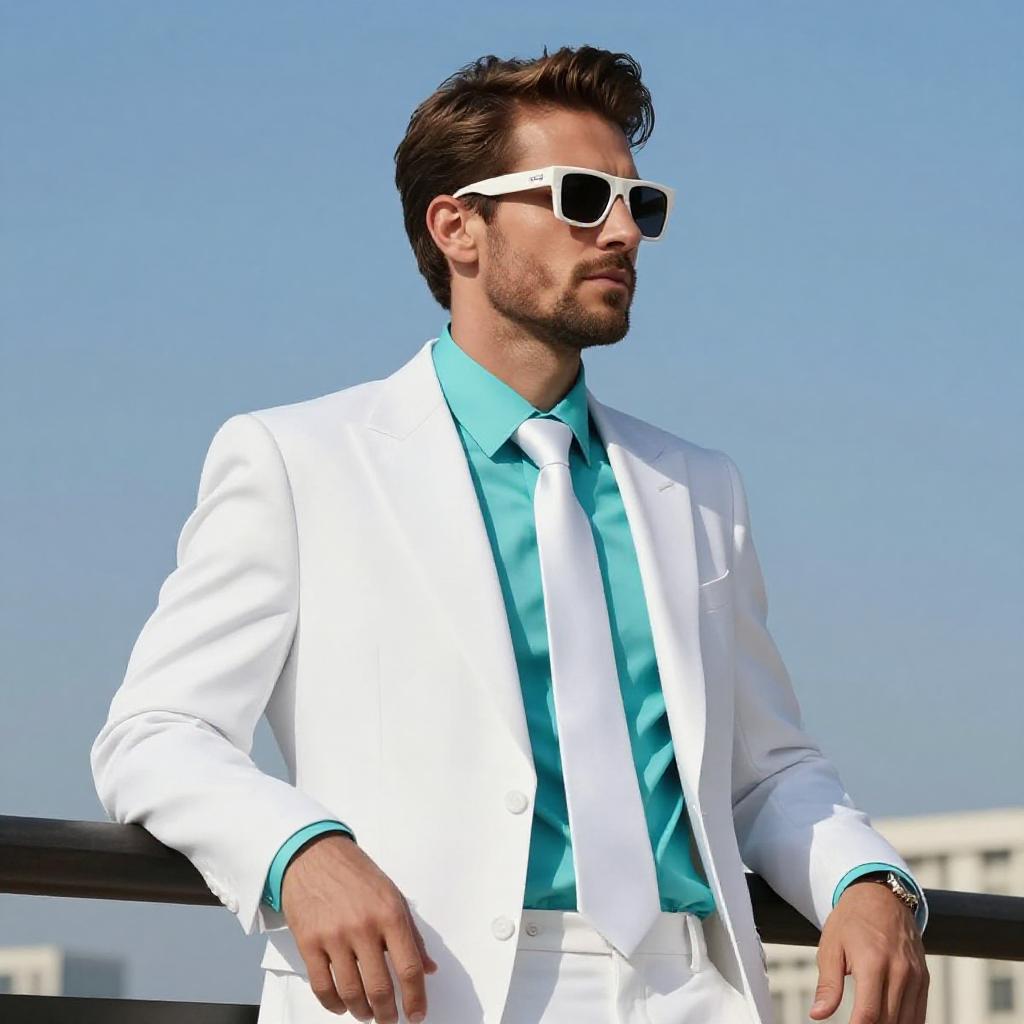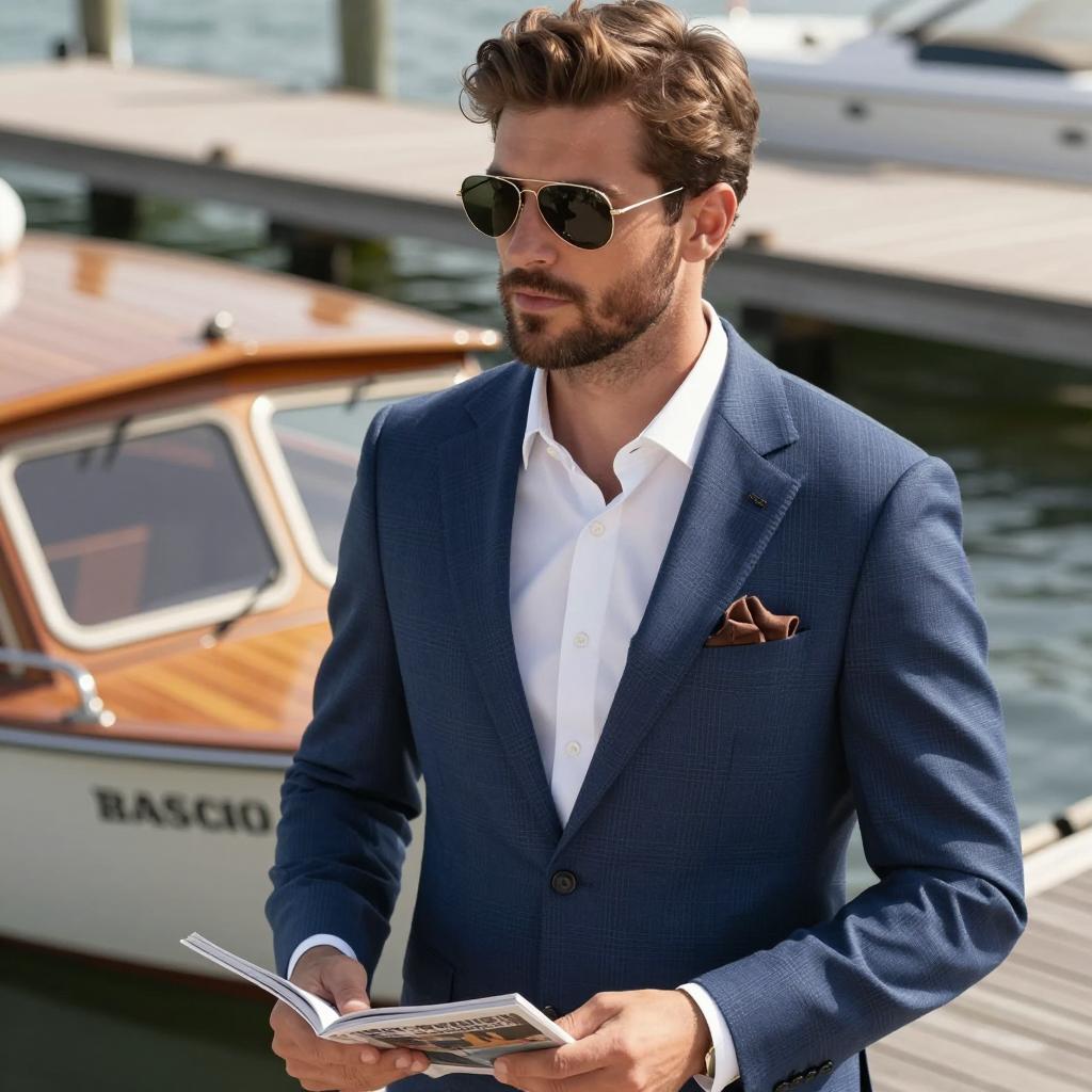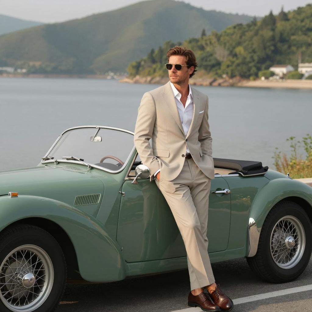 Photograph of a handsome man in a light beige suit, brown shoes, and sunglasses, leaning against a vintage green convertible car with wire-spoke wheels. He's standing on a coastal road with a calm lake and lush green hills in the background. The lighting is soft and natural, suggesting late afternoon. The camera angle is eye-level, and the depth of field keeps both the man and the car in focus, while the background is slightly blurred.
