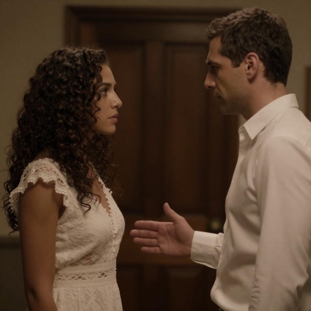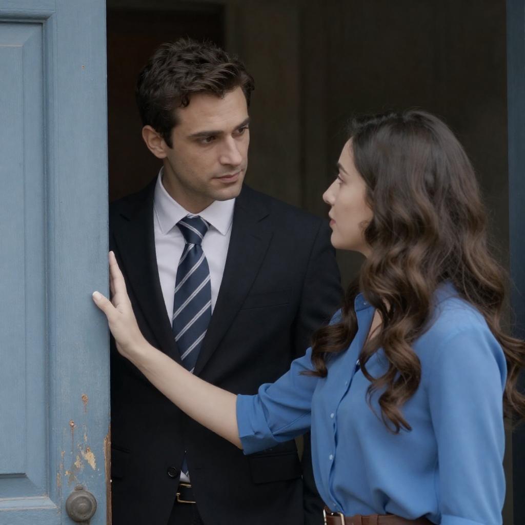 Photograph of a man and woman standing face to face in a dimly lit, elegant hallway. The woman has dark hair styled in a bun and is wearing a blue floral dress while gesturing with her right hand. The man is dressed in a blue blazer, white shirt, and khaki pants, looking down thoughtfully. The background features a wooden mantle and an arched doorway, adding to the classic interior setting.