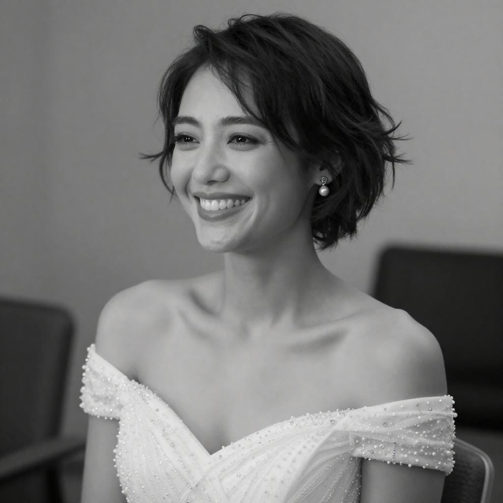Black-and-white portrait of a smiling young woman with short wavy hair wearing a white off-the-shoulder dress adorned with sparkling embellishments and pearl earrings. The image captures her looking slightly to the right against a softly blurred background that includes a chair.
