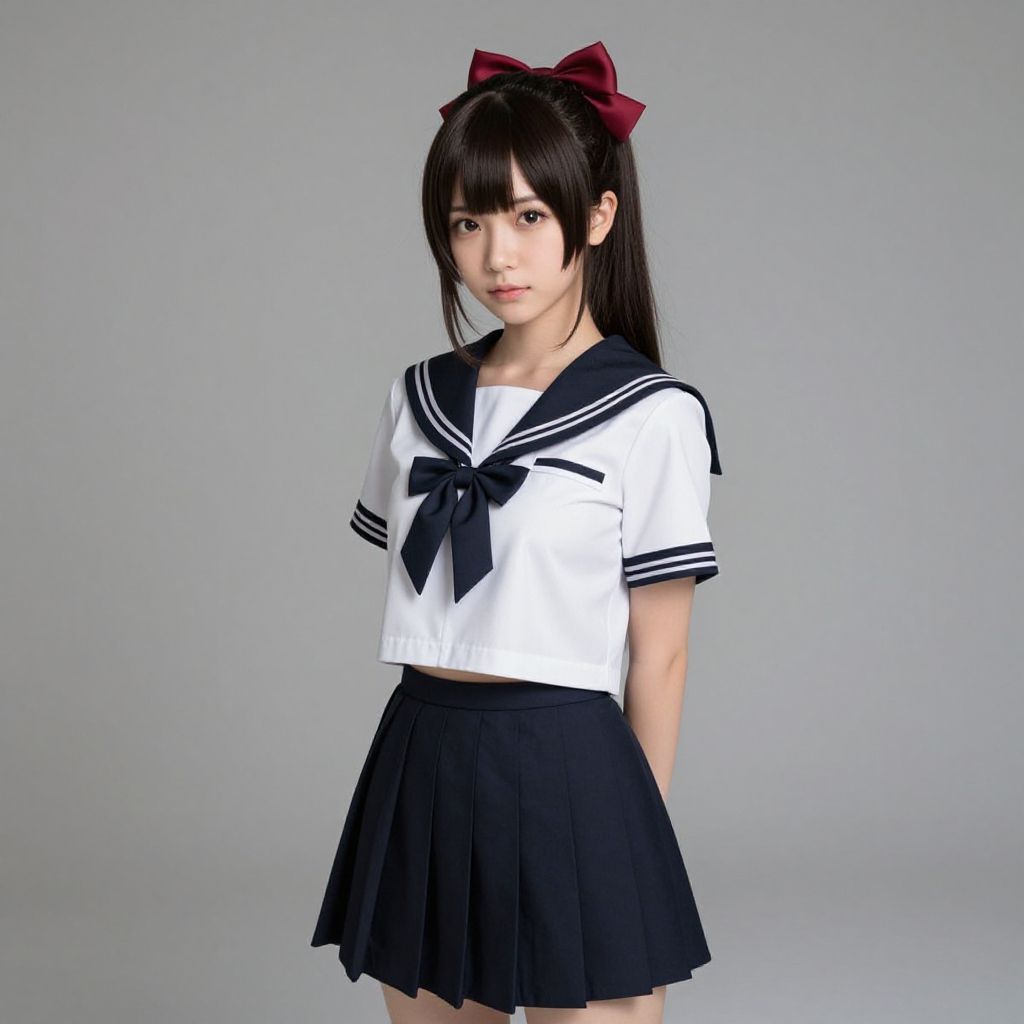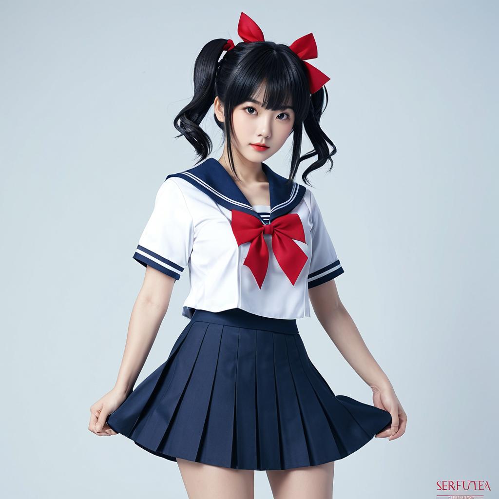 This is a digital CGI image of an anime-style girl with long black hair tied in twin ponytails with large red bows. She has fair skin and large, expressive brown eyes. She wears a navy blue sailor school uniform with a white long-sleeved shirt underneath, a red bow tie, and a pleated navy skirt. A small white anchor is on the right sleeve of her shirt. She stands against a dark gradient background, posing with her right hand raised slightly and her left hand on her hip. The lighting highlights her hair and uniform, creating a polished, realistic look.