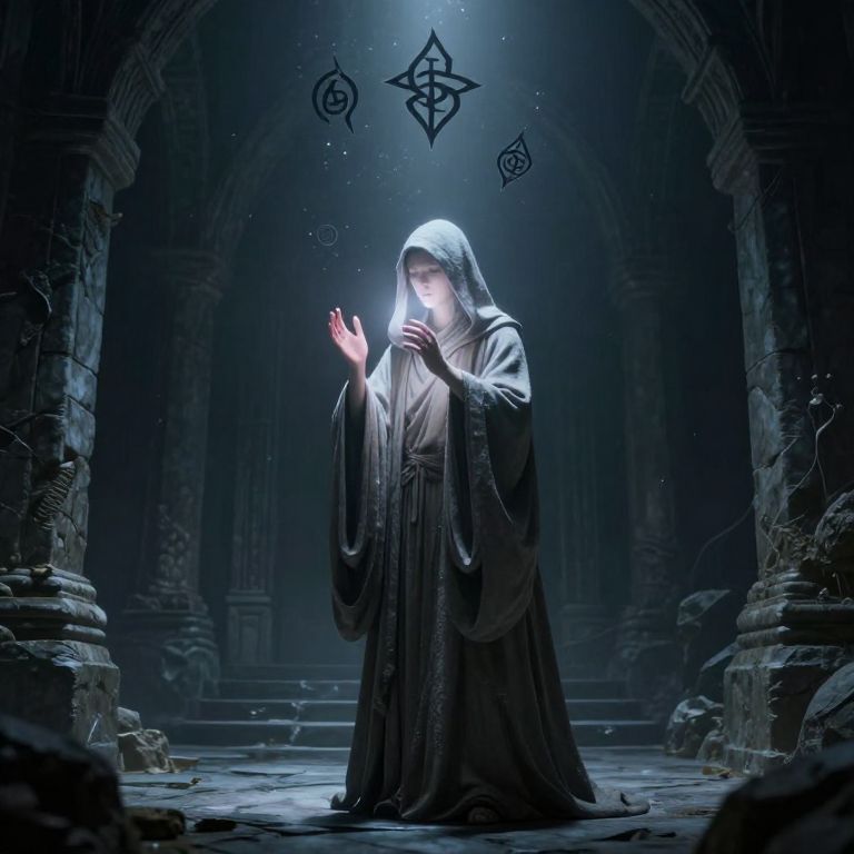Spell somber atmosphere in an ancient stone chamber, hooded figure chanting with ethereal light, dark magic symbols floating, cold tones, cinematic fantasy illustration