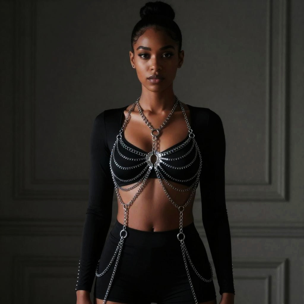 Photograph of a woman with dark skin, black hair in a bun, wearing a black outfit adorned with intricate silver chains forming skeletal patterns on the chest and arms. She stands against a dimly lit, paneled background. Her facial expression is neutral. The chains create a glowing effect against her dark outfit.