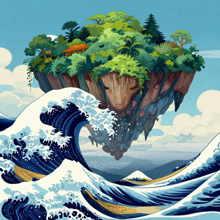 A digital masterpiece captures an awe-inspiring scene reminiscent of Hokusai's iconic \"The Great Wave off Kanagawa,\" reimagined with fantastical elements. A colossal floating island emerges from the crest of a vibrant wave, its lush vegetation stretching towards the sky. Viewed from beneath the wave, this mythical landscape invites viewers to embark on an enchanting journey through a world that balances serene tranquility with the exhilarating possibilities beyond the visible horizon. The artistic style is characterized by bold lines and rich colors, capturing both the grandeur of nature and the imagination's boundless potential.