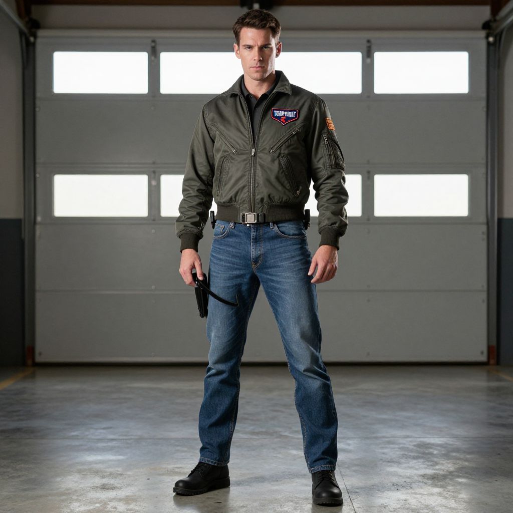 Top Gun Man Flight Suit Costume, man in a jacket and jeans standing in a garage