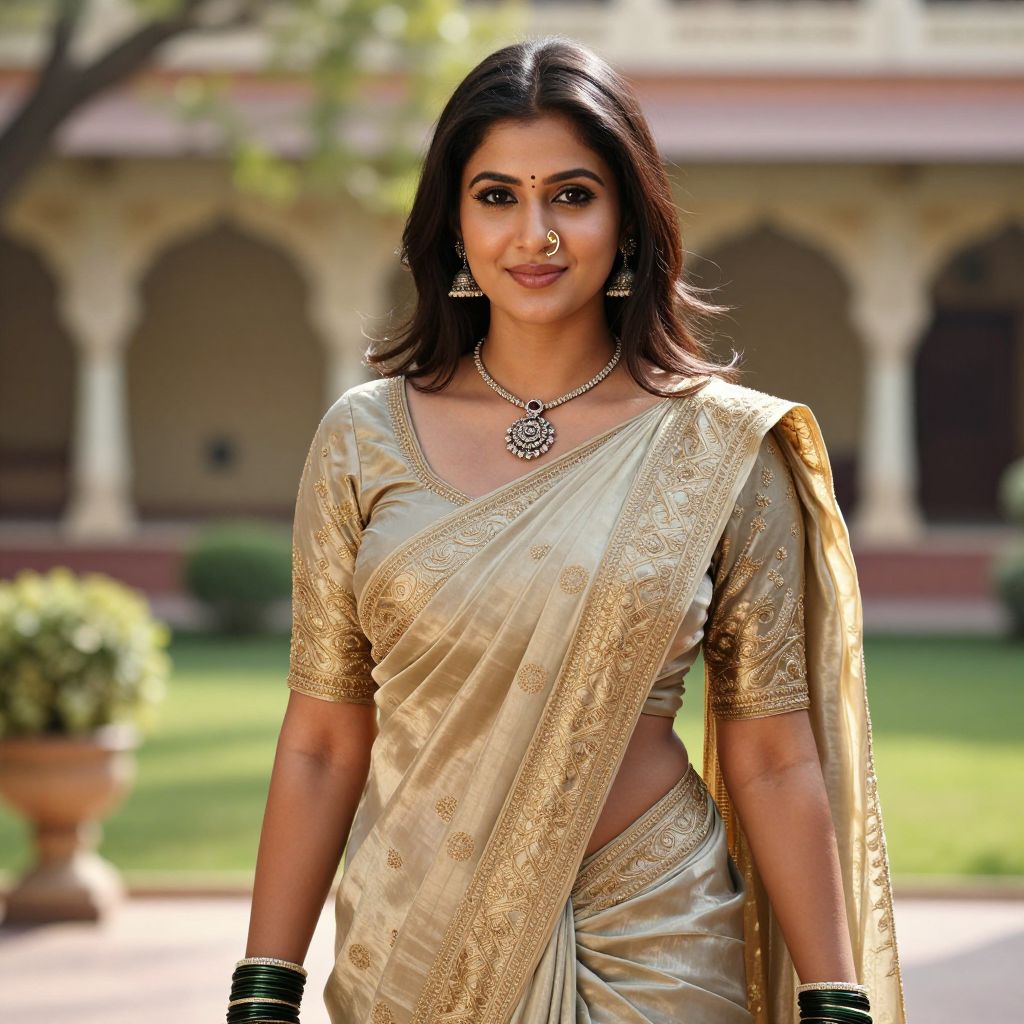 A graceful Indian woman in an elegant traditional saree, wearing a beautifully draped silk saree with intricate gold embroidery, flowing in soft sunlight at a lush courtyard in a historic Indian palace, her face radiant with warm, natural features—dark brown eyes, smooth skin, and a subtle smile, adorned with delicate silver jewelry including a floral pendant, bangles, and a nose ring, the saree draping beautifully over her shoulders and hips, capturing the elegance of South Asian culture in a photorealistic portrait style.. The woman has big tits and cute face