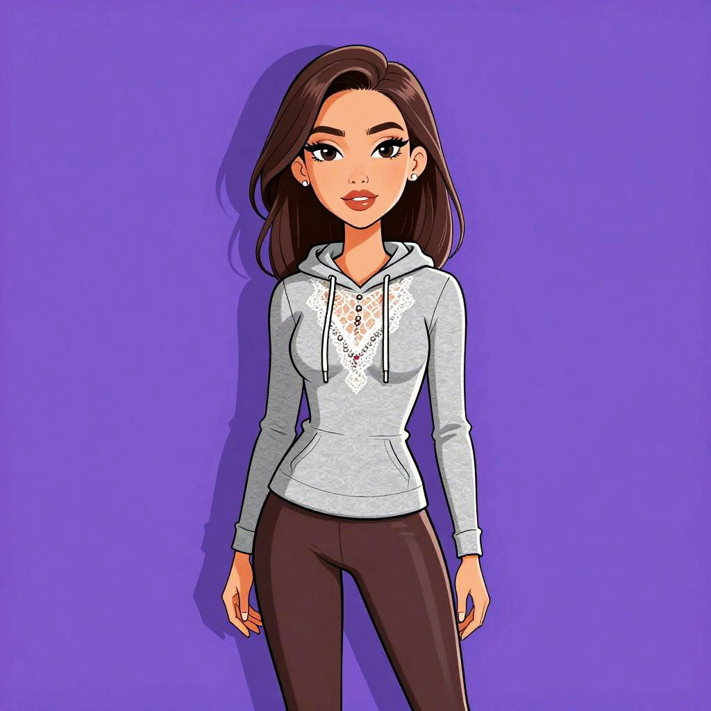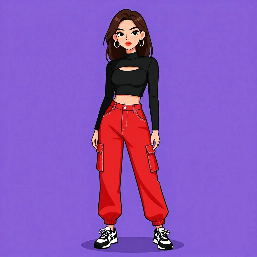Woman with pretty face and pretty hair. Woman, modern winter chic, light pink quilted puffer jacket with oversized collar and hood, matching quilted mittens, ribbed-knit beanie, coordinating light pink turtleneck sweater, high-waisted slim fit trousers, black and white chunky sneakers, photo studio background. --sref 1467