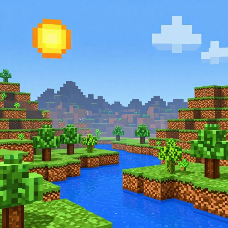 Pixelated Minecraft landscape featuring blocky mountains and rivers under a bright blue sky, with pixel art trees and a pixelated sun, rendered in vibrant colors, evoking a nostalgic gaming world atmosphere with a slight retro 8-bit style filter.