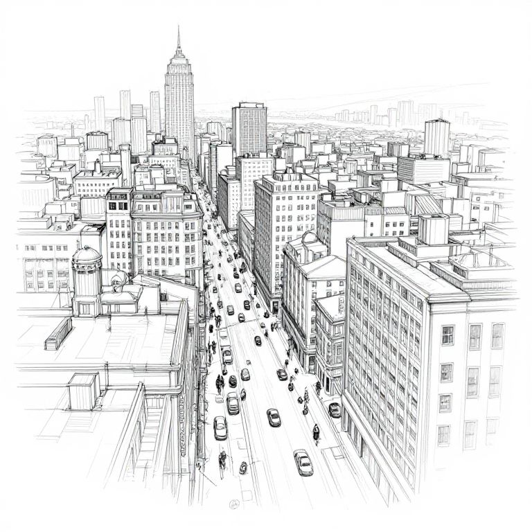 Intricate Cityscape Sketch Outline